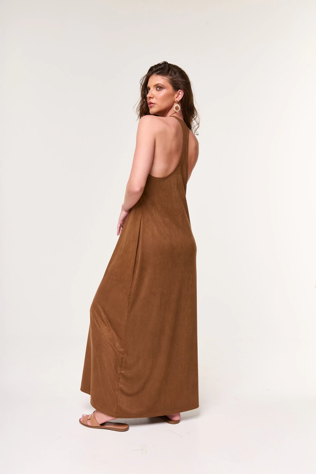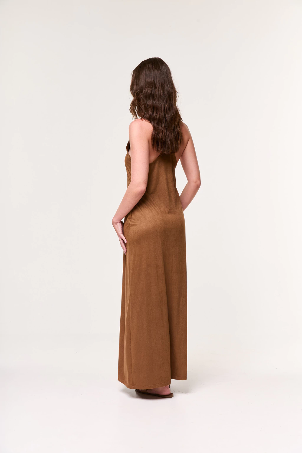 O design se destaca pelo decote profundo em formato de U na frente, que valoriza a silhueta, e um inovador estilo nadador nas costas, garantindo um toque moderno e sofisticado. A modelagem solta ao corpo proporciona liberdade de movimentos, sendo versátil entre situações do cotidiano e eventos especiais.